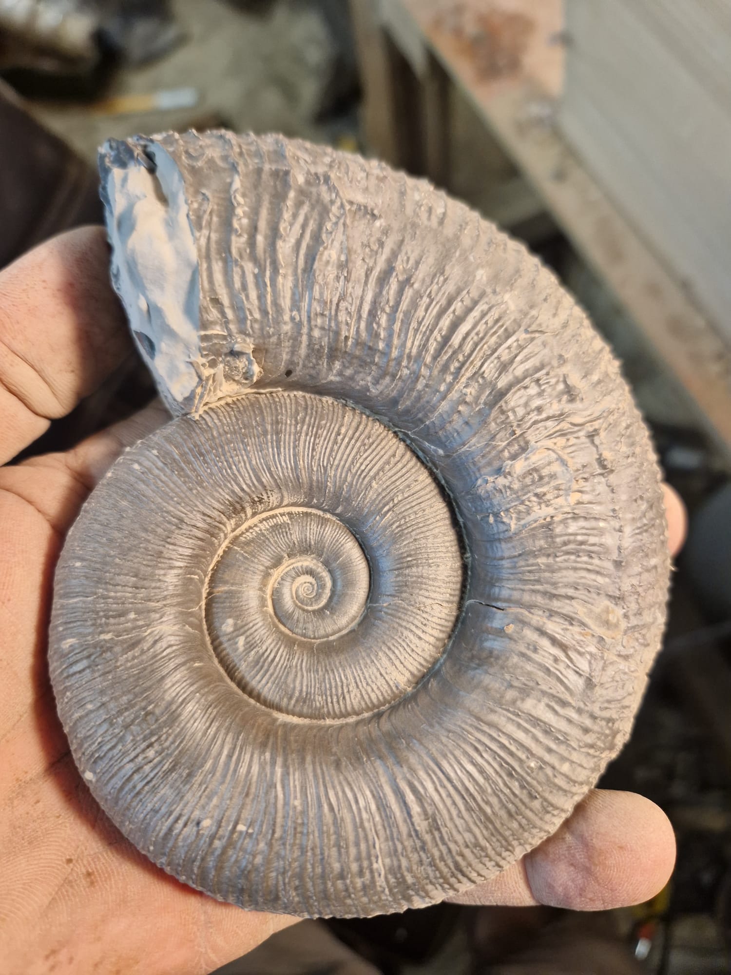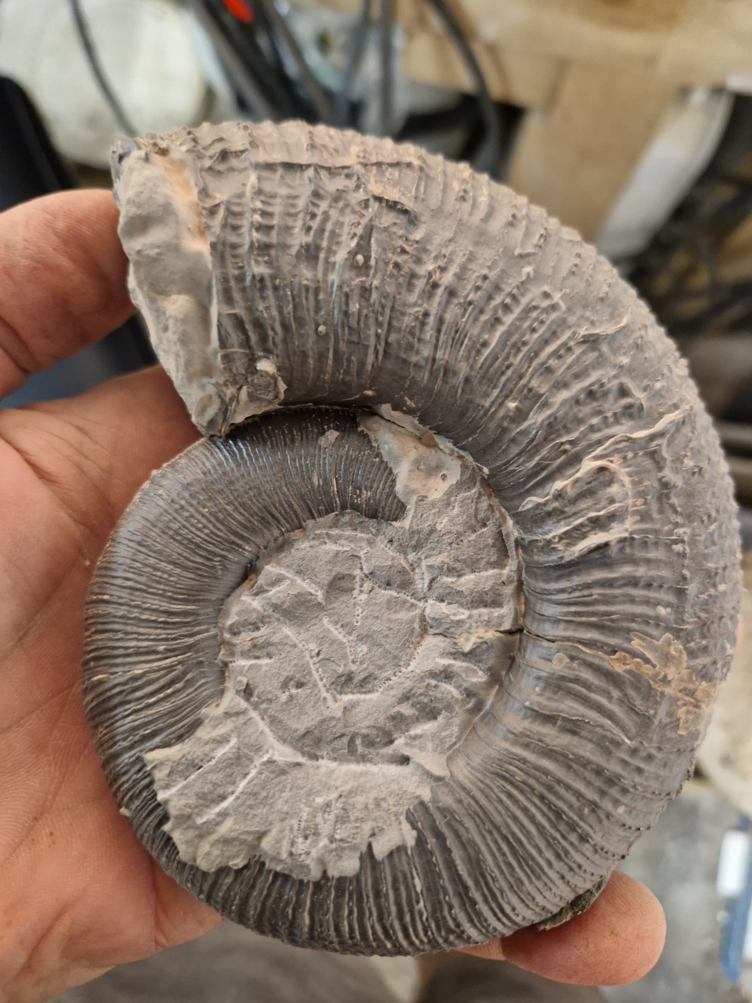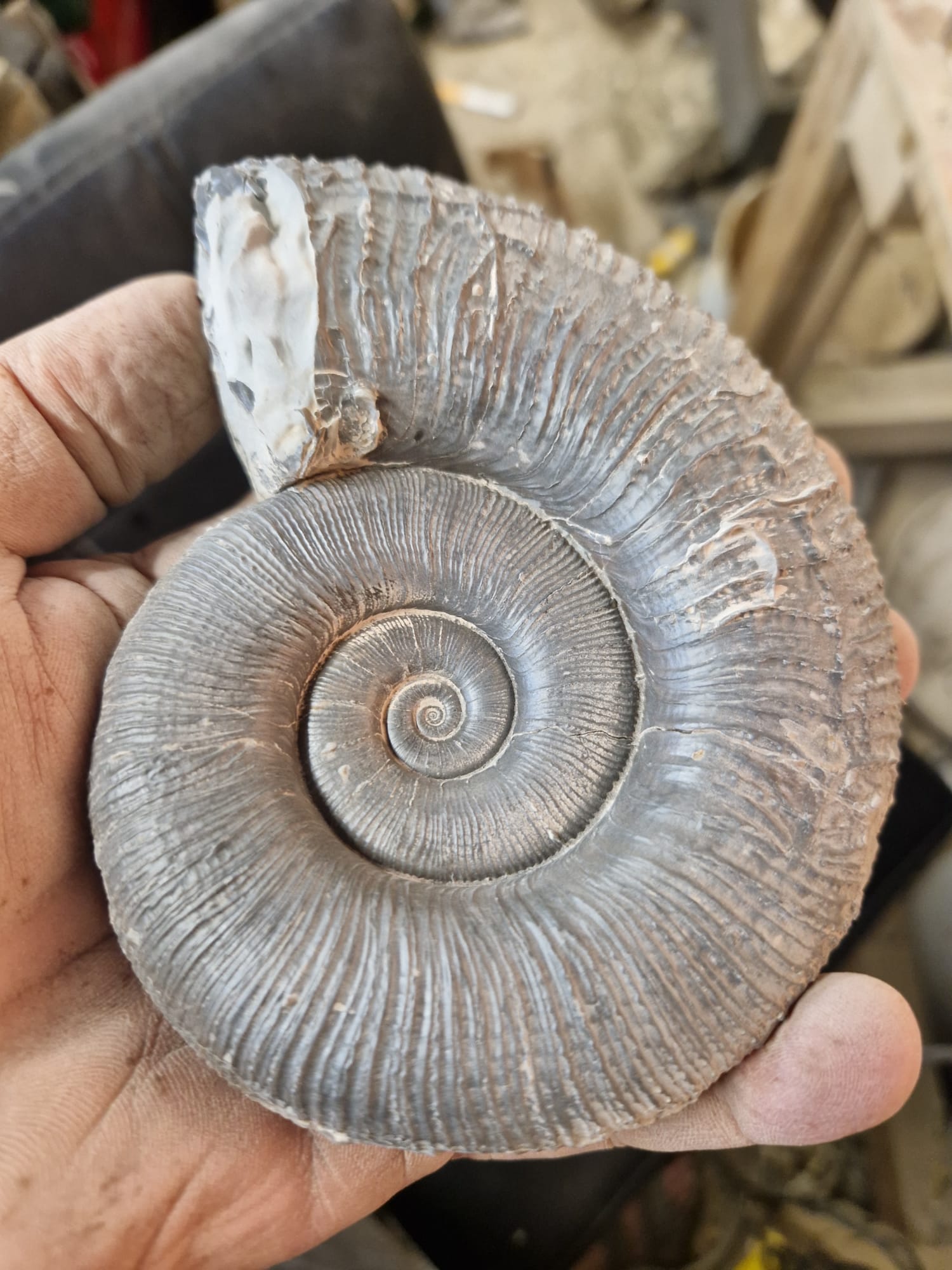 When an ammonite arrives in our workshop, it is far from ready to be sold on our website or displayed. The specimen is received in its raw, unprepared state, still encased in its rocky matrix, which completely hides the details of the fossil. This initial, unrefined condition prevents one from fully appreciating the ammonite’s beauty and structure, which requires meticulous preparation to reveal its optimal form.